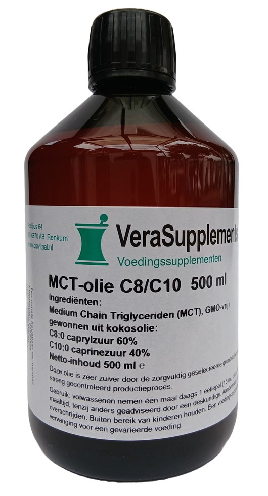 Medium chain triglyceriden (MCT’s) zijn middellange-ketentriglyceriden die zijn opgebouwd uit middellange, onverzadigde vetzuren met 6-12 koolstofatomen (C6-C12). De MCT-olie in dit product en bestaat echter uit pure MCT’s en bevat volgende vetzuren: 60% C8:0 caprylzuur en 40% C10:0 caprinezuur (het eerste getal geeft het aantal C (koolstof)-atomen weer en het laatste het aantal dubbele bindingen).